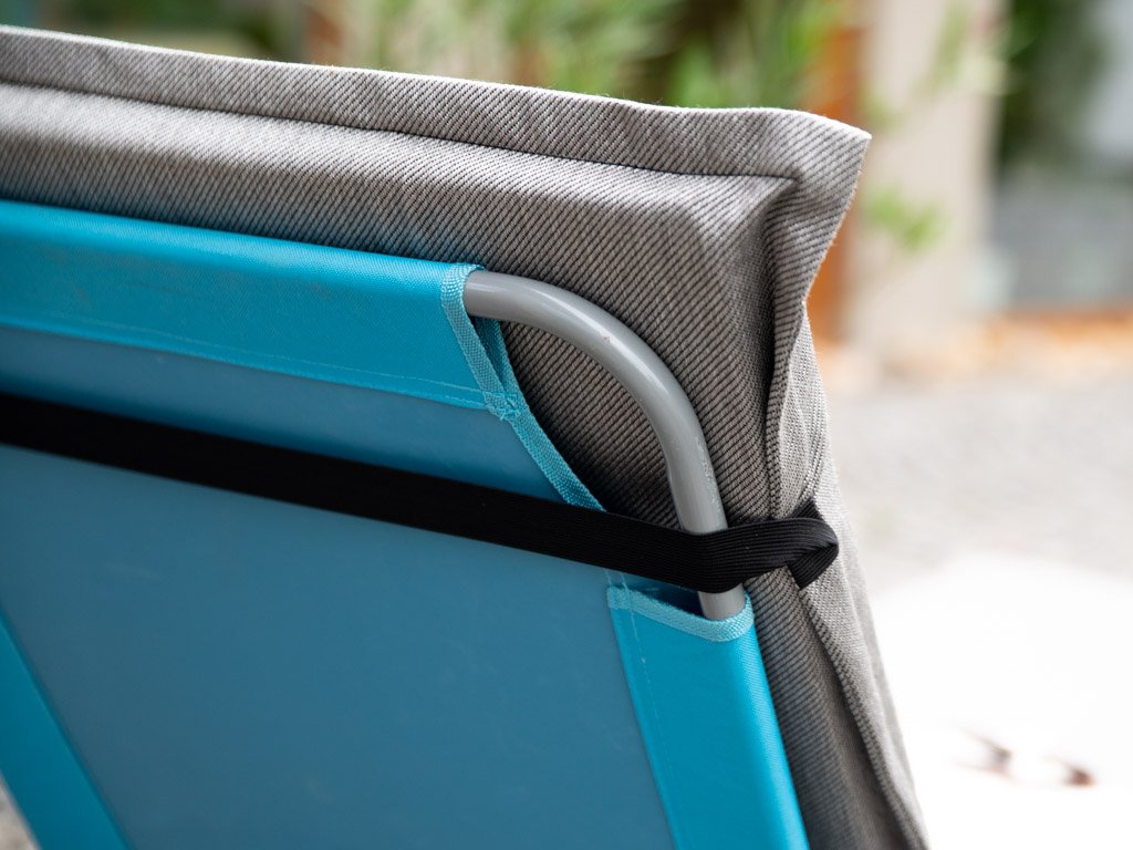 Sedežno blazino preprosto pritrdite na ležalnik s pomočjo elastike in vrvic. Vrvice in elastika so trdno prišite na obeh straneh sedežne blazine. Gumijaste vrvice zagotavljajo popolno prileganje, pa tudi enostavno odstranjevanje.