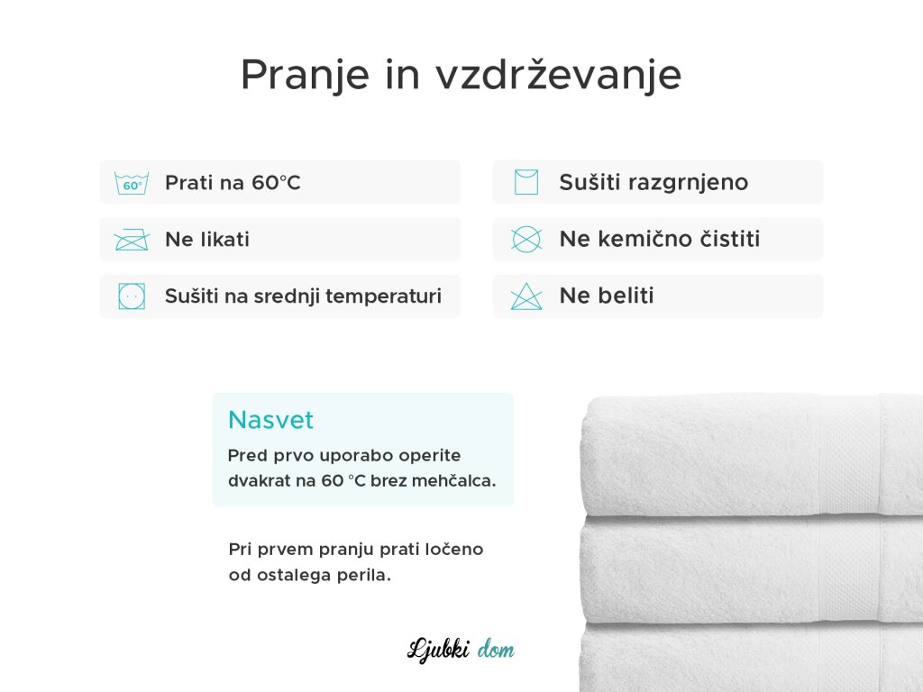 Si želite stalno nežnih in mehkih brisač? Najpomembnejše je pravilno vzdrževanje. Brisače priporočamo pred prvo uporabo oprati na temperaturi 40 °C, nato posušiti na stojalu ali v bobnastem sušilnem stroju na normalni ali nižji temperaturi. Brisače se ne smejo čistiti kemično, niti beliti. Likanje se ne priporoča iz razloga možnega poškodovanja zank, s čimer bi material izgubil svojo vpojnost in mehkobo.