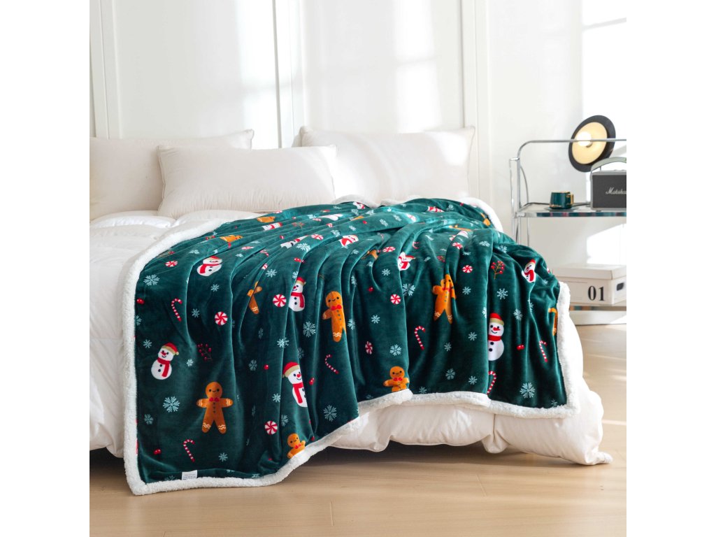 Božična temno zelena ovčka deka iz mikropliša SNOWMAN AND GINGERBREAD