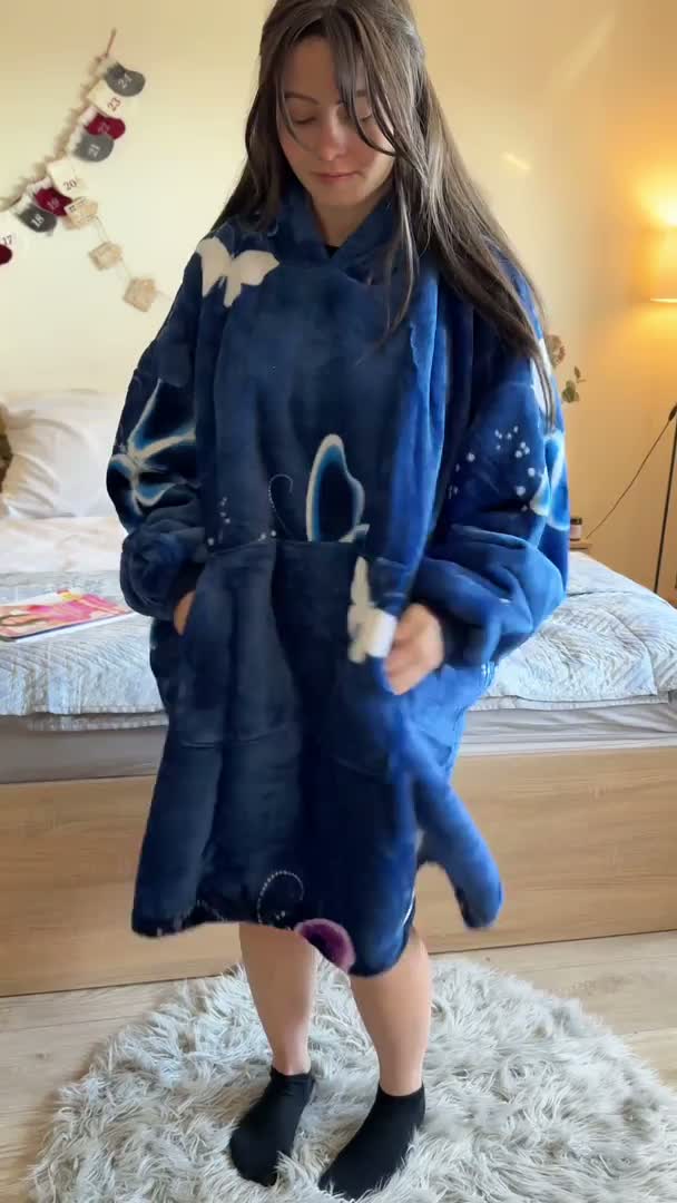 Topla odeja z imitacijo ovčje volne z rokavi in kapuco VIOLET BUTTERFLY, temno modra