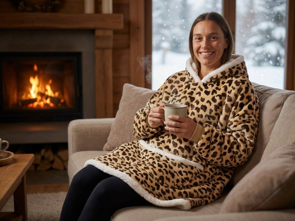 Topla odeja z imitacijo ovčje volne z rokavi in kapuco LEOPARD, kremna