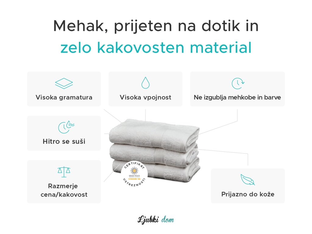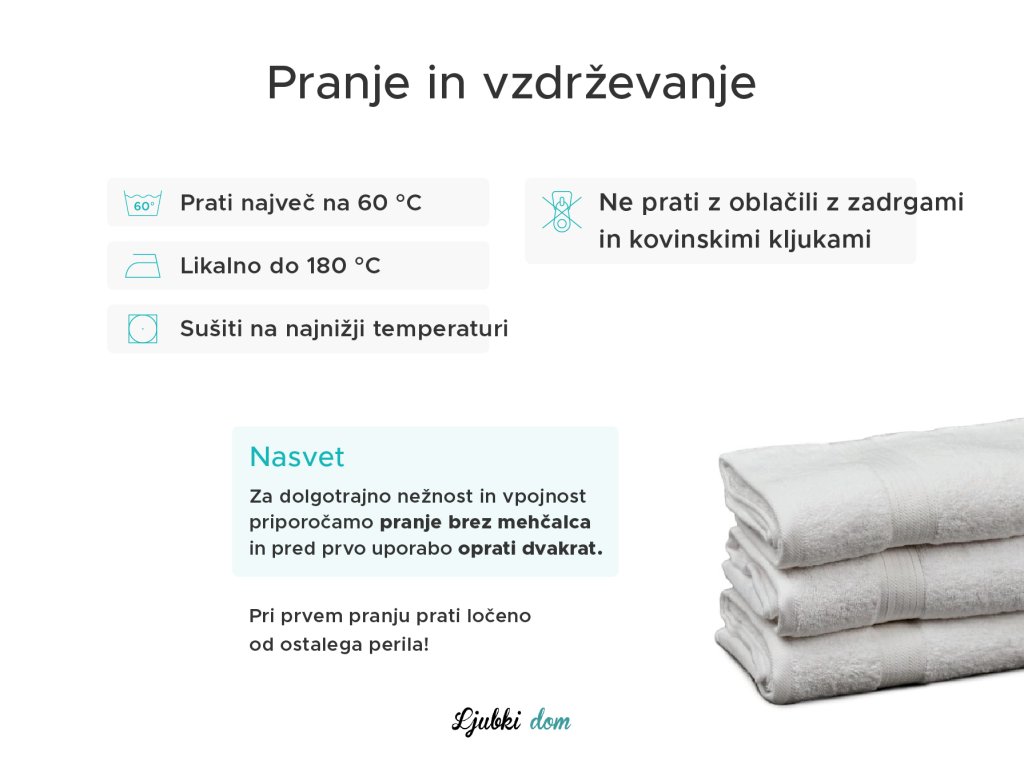 Naš nasvet: Za optimalno vpojnost in puhastost vlaken priporočamo, da brisače in brisačke pred prvo uporabo dvakrat operete brez uporabe mehčalca pri maksimalni temperaturi 60 °C.