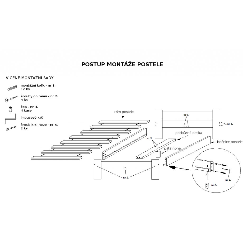 - Stranice postelje spojite s sestavljenim čelom in s priloženim imbus ključem privijte navojno palico v navojno matico.