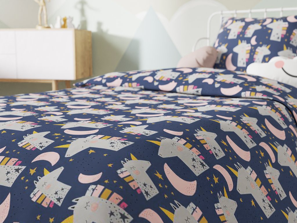 Postanite ponoči indijanec, motorist ali se potopite v svet pravljic. Slike na posteljnini vas bodo prenesle v skrivnostne globine sanj. Motiv z živalmi, cvetjem ali pravljičnimi junaki se poda v vsako otroško sobo. Vesele in žive barve se lahko zlahka kombinirajo z ostalo opremo. Ustarite izjemno sobo za najmlajše.