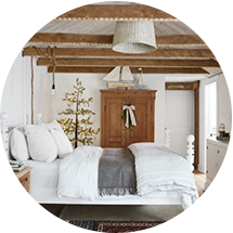 Spalnice v rustikalnem stilu so kombinacija naravnih barv in materialov. Poiščite navdih v naravi ali na podeželju. Romantičen in obenem elegantni stil se vrača nazaj h koreninam. Priskrbite si masivno posteljo z nočnimi omaricami in cel interier dopolnite z dodelanimi dodatki. Posteljnino s cvetličnimi motivi, karirastim vzorcem ali črtami dopolnite z rjuho in dekorativnimi vzglavniki v naravnih tonih. Udoben izgled bo v spalnici ustvarila deka, razgrnjena preko postelje in težke zavese.