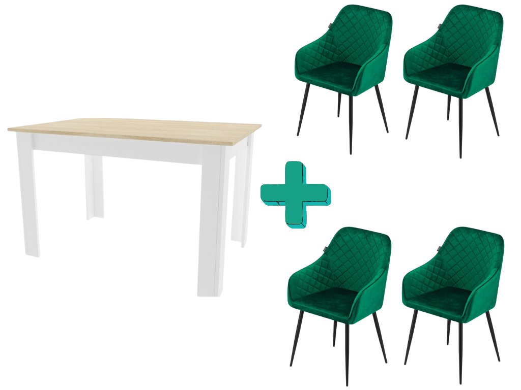 Jedilna garnitura 1+4, bela miza v dekorju sonoma hrast MADO 120x80cm in jedilni stoli NUGAT iz zelenega žameta