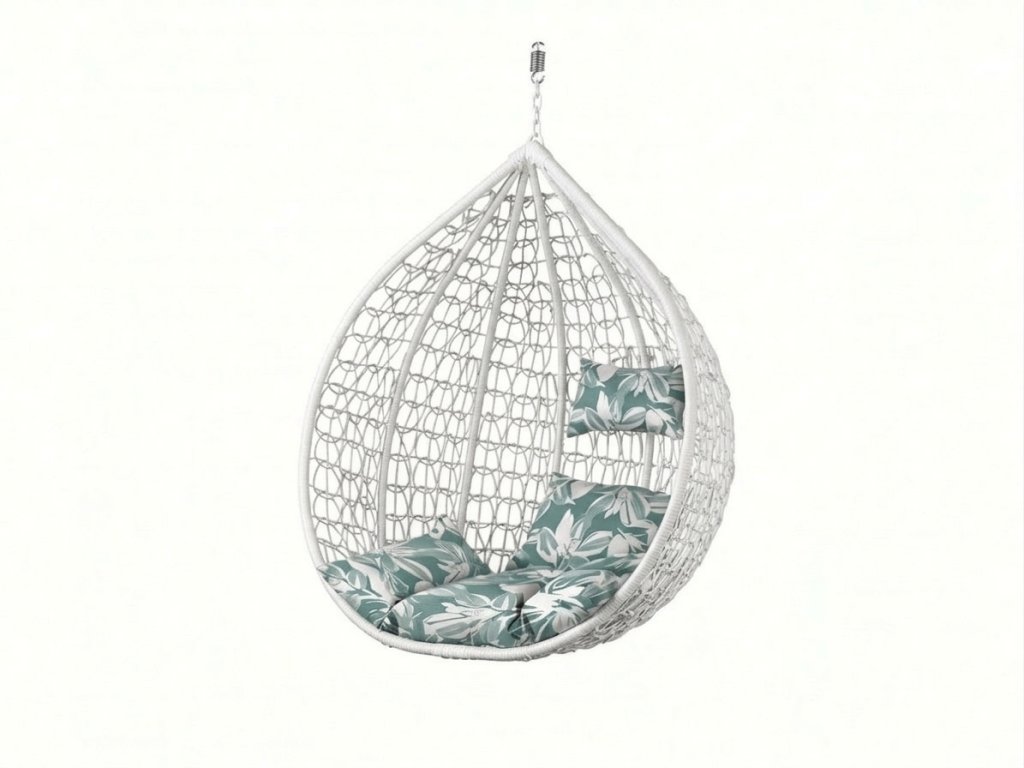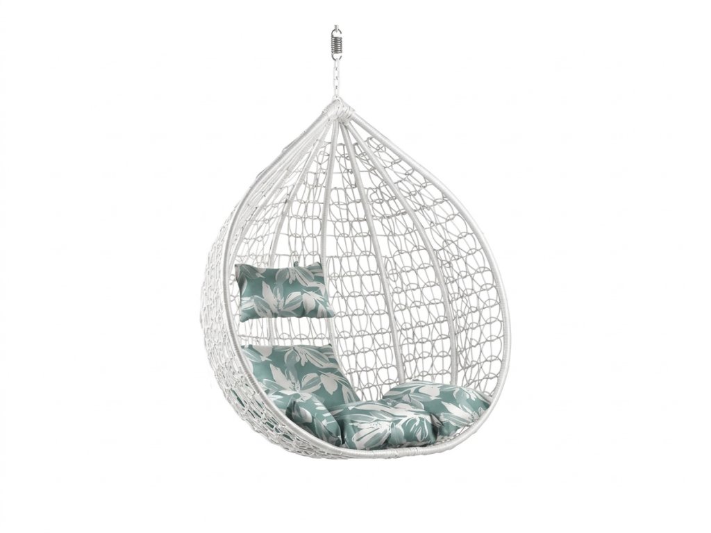 Beli viseči stol KOKON brez stojala, zeleni-beli vzglavnik