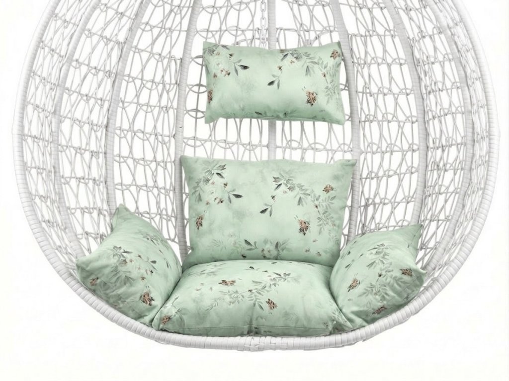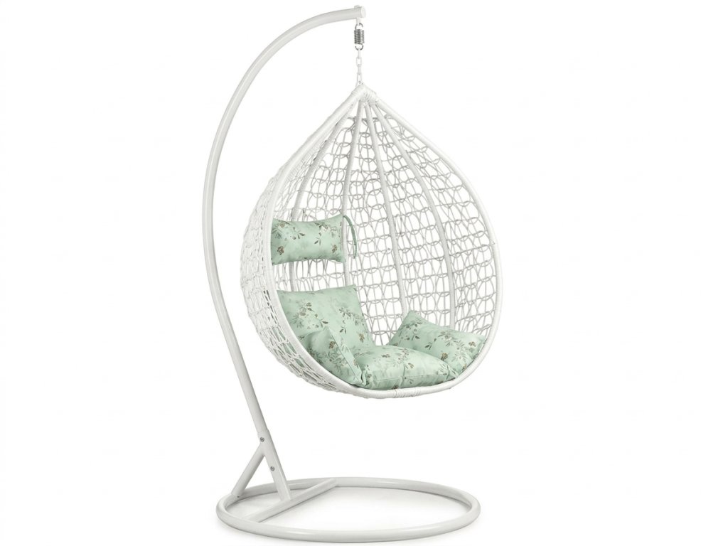 Beli viseči stol KOKON s stojalom, svetlo zelena blazina z vzorcem